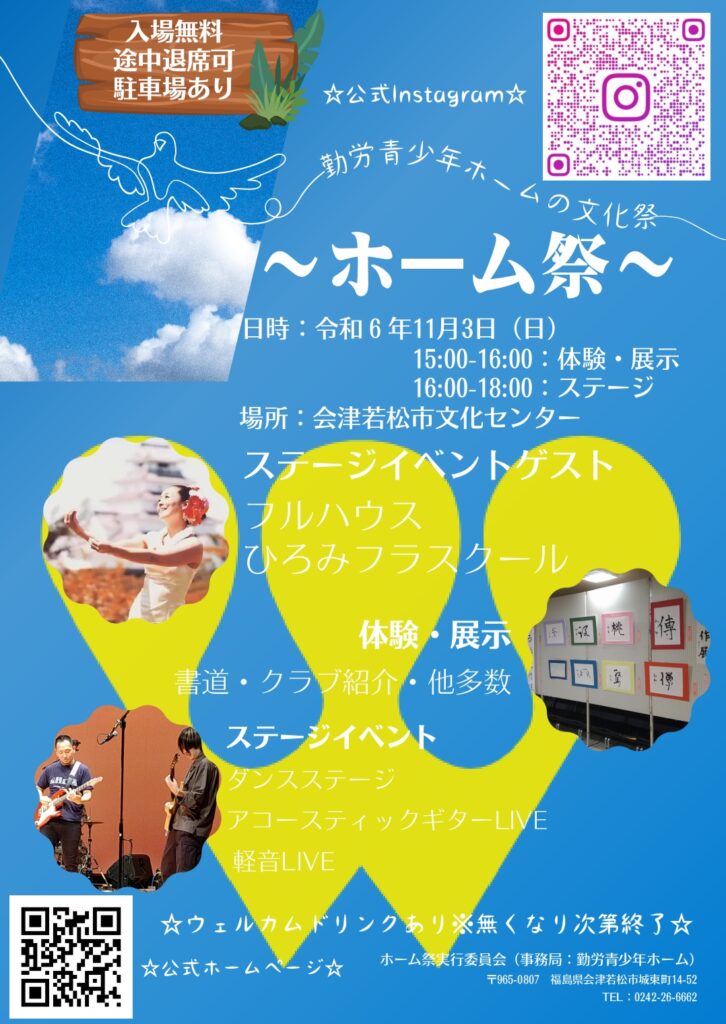 令和6年度11月3日(日)会津若松市文化センターで会津若松市勤労青少年ホームのホーム祭が開催されます。詳細は以下の通り!!
